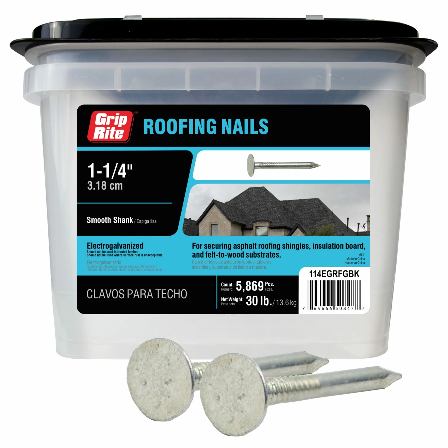 Grip-Rite fasteners are the choice of contractors who want professional results from a brand they know and trust. Grip-Rite galvanized roofing nails are used for applying asphalt shingles, insulation board, and felt to wood substrates. Roofing nails have a large head and thicker barbed shank to provide greater holding power. Roofing nails are also used to install vinyl siding as well.