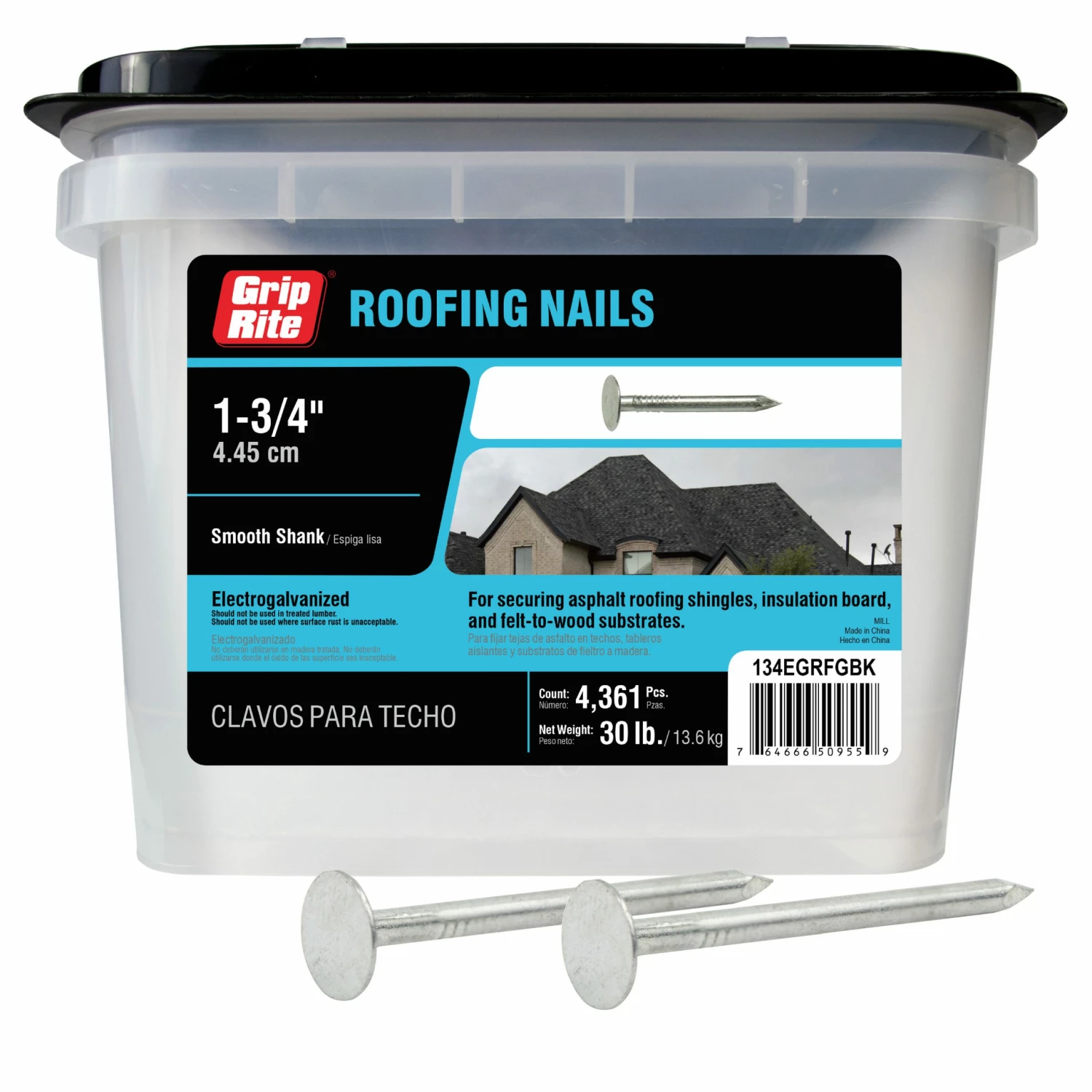 Grip-Rite fasteners are the choice of contractors who want professional results from a brand they know and trust. Grip-Rite galvanized roofing nails are used for applying asphalt shingles, insulation board, and felt to wood substrates. Roofing nails have a large head and thicker barbed shank to provide greater holding power. Roofing nails are also used to install vinyl siding as well.