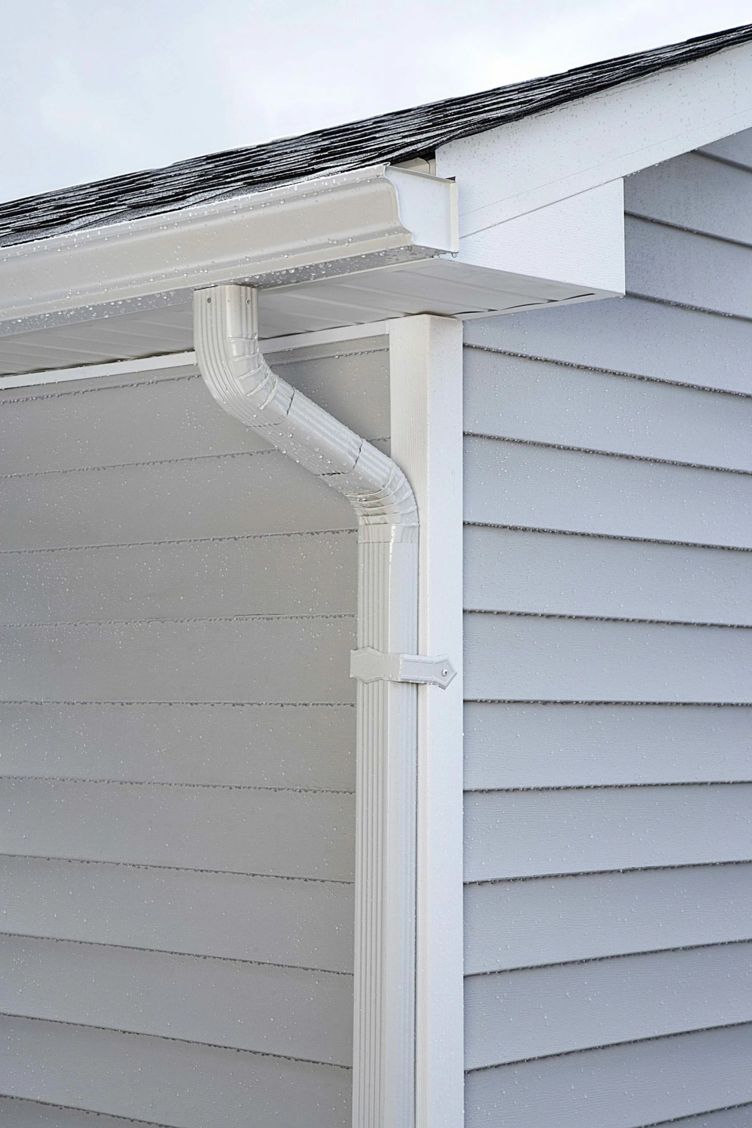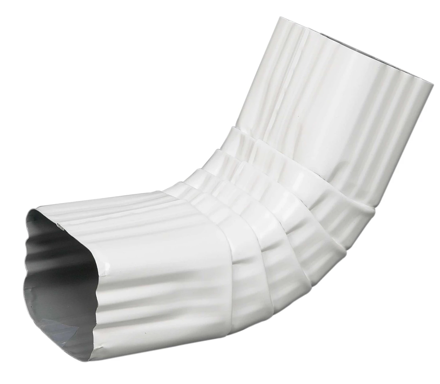 Factory baked on finish. Front elbow used at top and bottom of downspout to guide run off directly away from the wall.