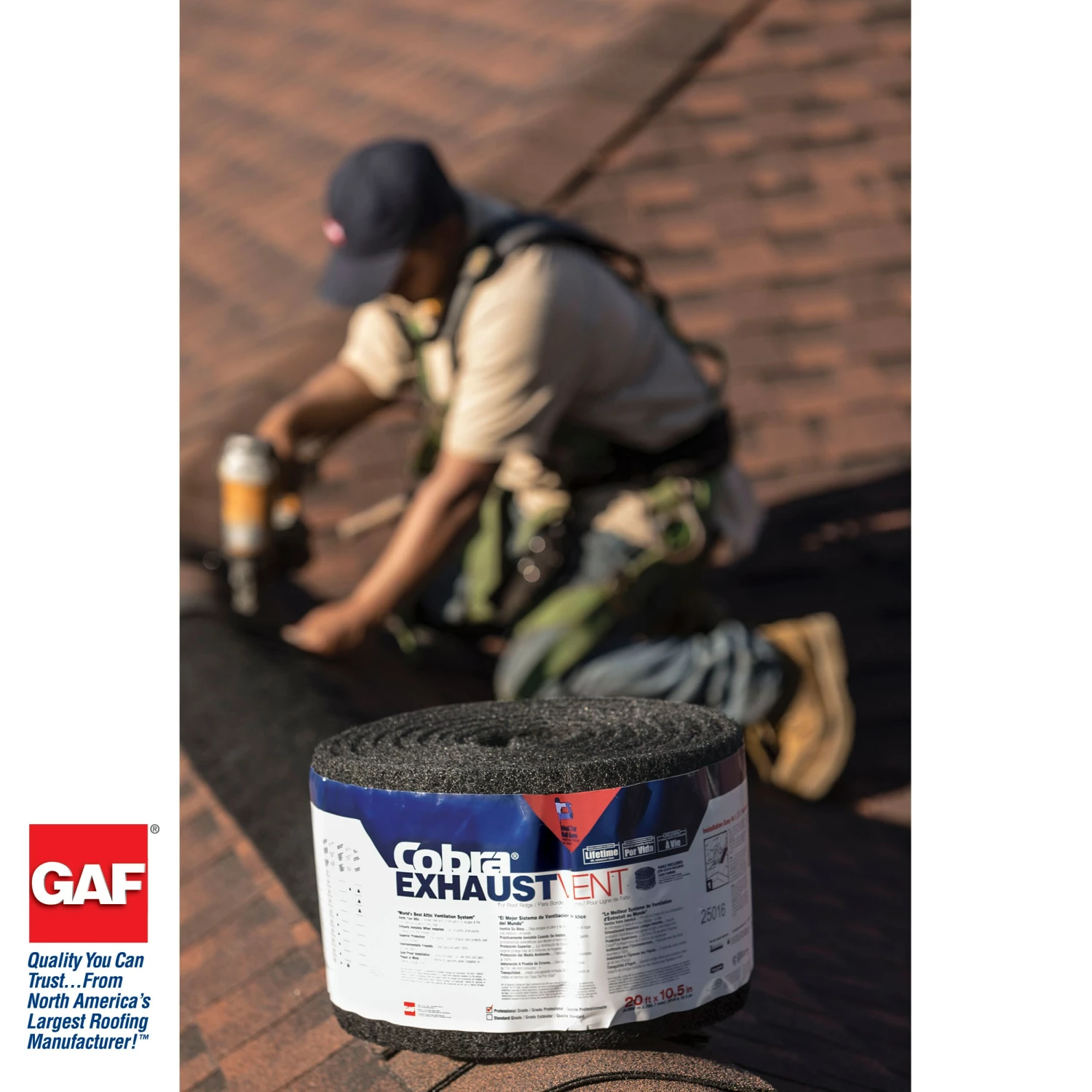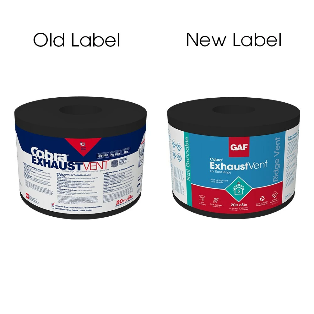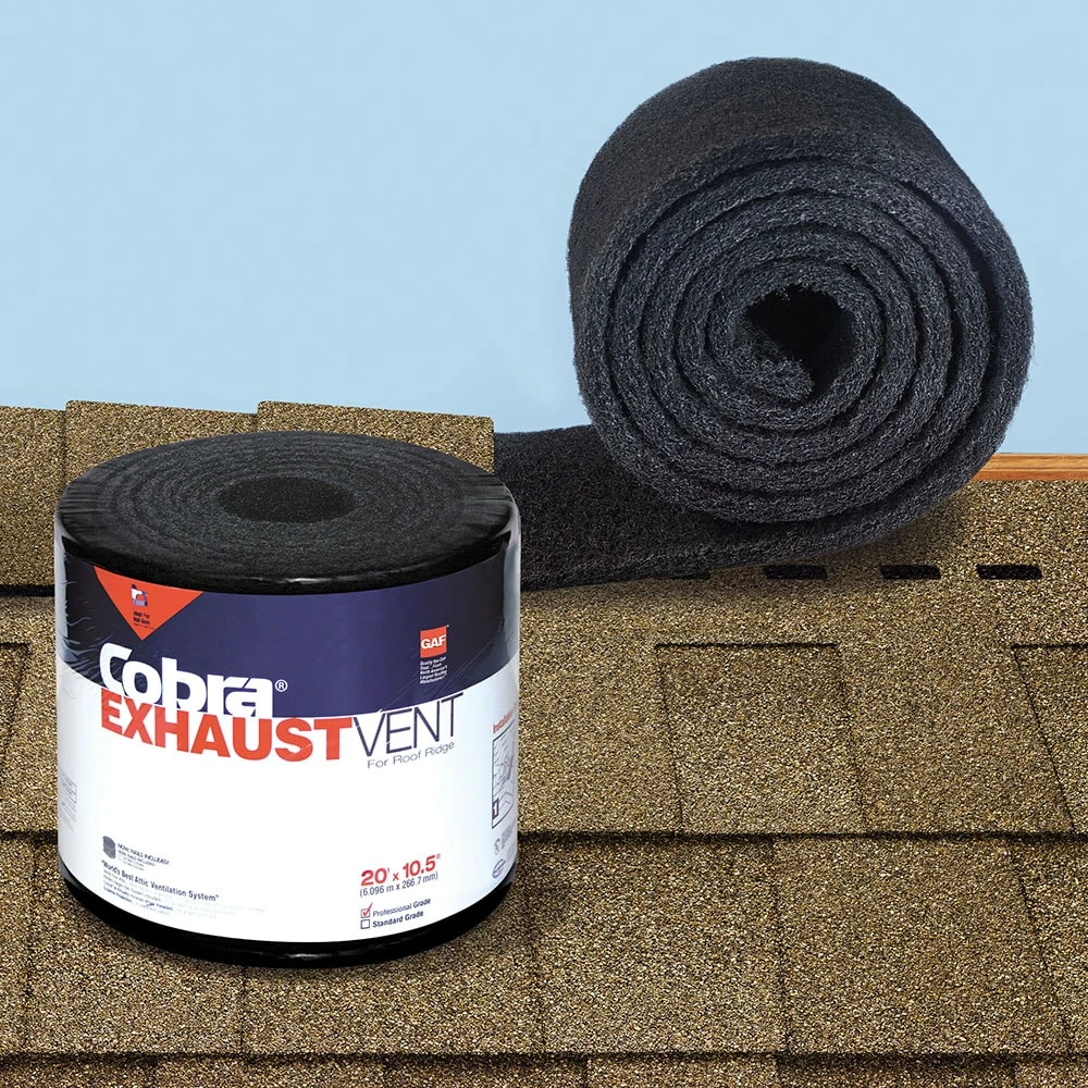 Cobra® Exhaust ridge vent is a shingle-over exhaust vent installed at the roof ridge that helps exhaust excess heat and moisture from your attic. It comes on a mesh roll for fast and easy installation with no complicated fitting, wrapping, nail gun adapters, connectors, or end-plugs needed. Available in both hand nail and nail gun versions, its shingle-over design helps it blend into the ridge line. Cobra® Exhaust Vent is available in all climates and is a key part of the GAF Lifetime Roofing System and is eligible for a Lifetime Limited Warranty when installed on lifetime shingle roofs.