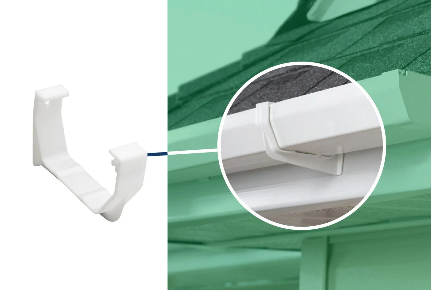 - Use the external hook to mount contemporary style vinyl gutter to the roof line