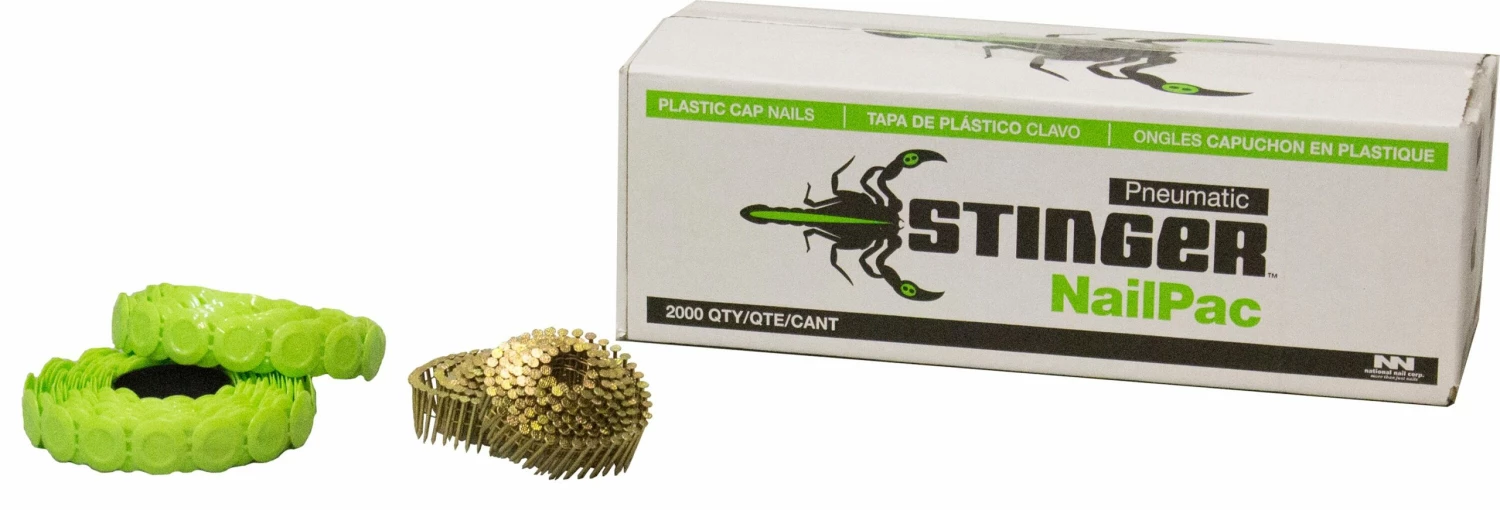 The Stinger 1 in. Nail Pac contains 10 rolls of 200 collated plastic caps and 10 coils of 200 nails. NailPac contains 1 in. collated caps and 1 in. nails. Cap nails are a recommended best practice for securing roofing underlayments of felt and house wrap where nails are required. The 1 in. NailPac is for use with the Stinger CN100B Cap Nailer only.